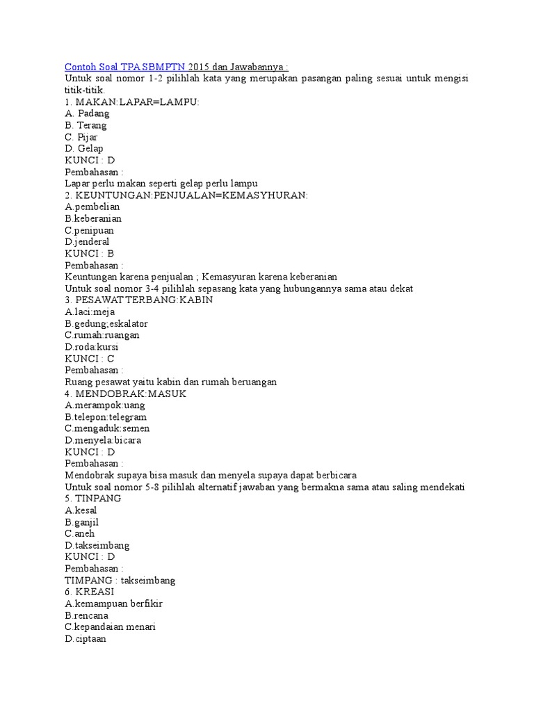Untuk tpa, teman-teman bisa pelajari soal-soal dari buku atau internet (referensinya bisa ambil tipe tiu dan tkp nya tes cpns, atau bisa belajar tpa bappenas) untuk eots teman-teman mau tidak mau harus update berita terkini dalam setahun terakhir, kalau bisa lihat dari berbagai sudut pandang agar pendapat yang teman-teman berikan bisa lebih kuat. Contoh soal tes verbal potensi akademik dan kunci jawaban pada kesempatan kali ini saya akan memberikan kumpulan contoh soal lengkap untuk tes potensi akademik tpa dengan tema soal tes verbal yang berjumlah 114 soal yang lengkap dengan kunci jawabannya. sehingga sobat dapat belajar dirumah tanpa kebingungan dengan jawaban yang masih belum di mengerti. Download soal dan pembahasan utbk (sbmptn) 2019 tps (pemahaman kognitif) usai sudah penyelenggaraan tes utbk 2019 atau sbmptn tahun 2019. guna mempersiapkan tes masuk ptn (utbk / sbmptn) tahun 2020/2021, berikut ini bisa dijadikan bocoran soal utbk 2020/2019, berupa soal utbk 2019 tps pdf doc. silahkan download dan dimiliki.
